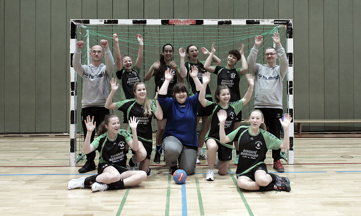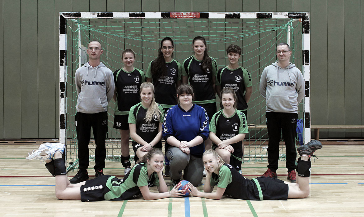 Hintere Reihe (v.l.): Michael Mehrlich (Betreuer), Rebecca Wahl, Esra Demirci, Theresa Scheurich, Kim Kern, Markus Mehrlich (Betreuer). Mittlere Reihe: Nicola Dobler, Lena Hemmelmann, Lara Scholz. Liegend: Cecilie Kordowich, Helen Hilpert.